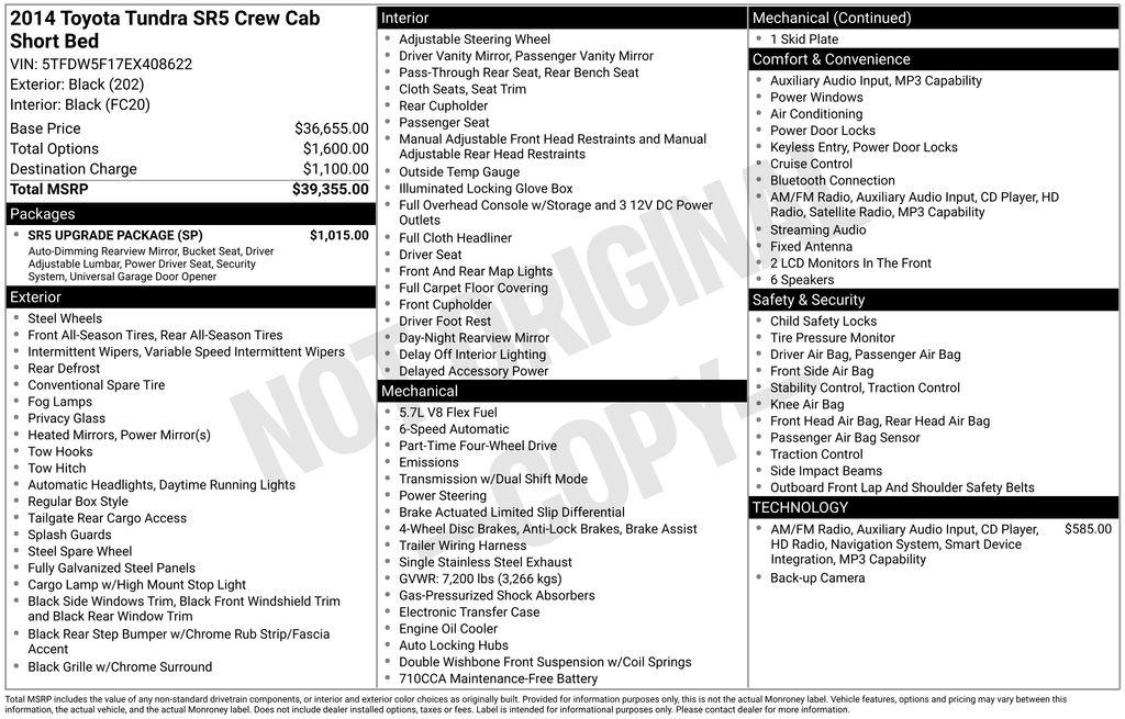 Discover the power and versatility of the 2014 Toyota Tundra SR5 CrewMax. This impressive full-size pickup offers the perfect blend of capability, comfort, and cutting-edge technology to elevate your driving experience.- 160 Point Inspection- Dealer Detailed- Recent Oil Change- RADIO: ENTUNE AM/FM/HD W/CD PLAYER- SR5 UPGRADE PACKAGE- HomeLink Universal Transceiver- Auto-Dimming Rear-View Mirror- Compass- Front Bucket Seats- Anti-Theft Immobilizer w/AlarmBeneath the bold, assertive exterior lies the power of the i-Force 5.7L V8 Flex Fuel DOHC 32V LEV engine, delivering a commanding 381 horsepower and 401 lb-ft of torque. Paired with a smooth-shifting 6-Speed Automatic Electronic with Overdrive transmission, this Tundra SR5 CrewMax delivers the muscle you need for any task, whether it's hauling heavy loads or tackling tough terrain with its 4WD system.Despite its rugged capabilities, the Tundra SR5 CrewMax also offers a refined and comfortable interior. Enjoy the convenience of the Entune infotainment system, featuring a high-resolution 7"" touch-screen display, navigation, and a host of connected services. The SR5 Upgrade Package adds even more premium features, including a power-adjustable driver's seat, auto-dimming rearview mirror, and HomeLink universal transceiver for seamless integration with your smart home devices.With its impressive towing capacity, spacious cabin, and advanced technology, the 2014 Toyota Tundra SR5 CrewMax is the perfect companion for your active lifestyle. Experience the perfect balance of capability and comfort behind the wheel of this exceptional full-size pickup. Visit our showroom today and let us demonstrate why the Tundra SR5 CrewMax should be your next vehicle.