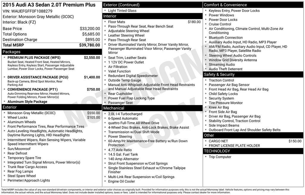 Recent Arrival! 2015 Audi A3 2.0T Premium Plus quattro Clean CARFAX.quattro, Black Leather, 12-Way Power Passenger Seat w/4-Way Power Lumbar, 3-Step Heated Front Seats, Aluminum Interior Package, Aluminum Mistral Decorative Inlays, Aluminum Style Package, Audi Advanced Key, Audi Music Interface w/iPod Integration, Audi Parking System Plus w/Rearview Camera, Audi Side Assist, Auto-Dimming Interior Mirror w/Digital Compass, Cold Weather Package, Convenience Package, Driver Assistance Package, Heated Side Mirrors, Heated Windshield Washer Nozzles, High-Gloss Aluminum Window Surrounds, Interior Storage Package, LED Interior Lighting Package, Power moonroof, Power-Folding Side Mirrors, Premium Plus Package, Wheels: 8.0J x 18"" 10-Spoke-Audi-Exclusive. Odometer is 30063 miles below market average!Discover the difference at Audi Mobile, proudly serving Mobile, Daphne, Fairhope, Spanish Fort, Gulf Shores, Biloxi, and the entire Gulf Coast region. Conveniently located in the heart of Mobile, Alabama, our 13-acre campus offers one of the area’s largest selections of new Audi models and premium pre-owned vehicles. At Audi Mobile, we believe buying a vehicle should be simple, transparent, and enjoyable. That’s why we created the Carlock Clear Program—the only way to buy a car with integrity. One client advisor guides you through the process from start to finish, and you’ll always get the best price upfront with no hassle, no games, and no surprises. Whether you’re driving in from Pensacola, Pascagoula, or right here in Mobile, you’ll be greeted with warm Southern hospitality and a commitment to making your experience seamless. Audi Mobile isn’t just a dealership—it’s your trusted automotive partner on the Gulf Coast.Stop by and experience the Audi of Mobile difference at: Audi of Mobile 1445 E Interstate 65 Service Rd S, Mobile, AL 36606 Call us at 833-617-7951 Visit us at https://www.audimobileal.com/ to browse inventory or get directionS.Reviews: * You’ll like the Audi A3 if you’re in the market for a smaller and consequently cheaper luxury car. More traditional than the Mercedes-Benz CLA and more legit than the Acura ILX, the new A3 feels like a real-deal premium car, and an available diesel engine is unique to the class. Source: KBB.com * Superior cabin quality and design; efficient and punchy engines; nimble handling, ample equipment. Source: Edmunds