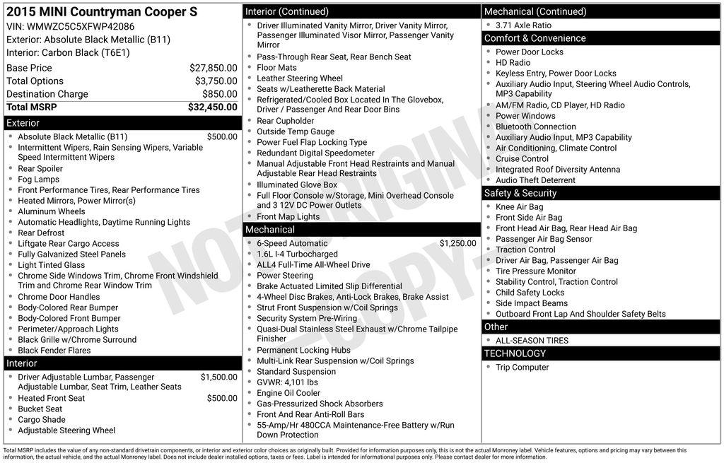 Discover the perfect balance of style, performance, and versatility in this 2015 MINI Cooper S Countryman Base. This all-wheel-drive compact crossover offers an exhilarating driving experience combined with the practicality and space you need for your active lifestyle.• Bluetooth® and USB/iPod Adapter• Heated Front Seats• Sport SeatsPowered by a 1.6L I4 DOHC 16V Turbocharged engine paired with a 6-Speed Automatic Steptronic transmission, this MINI delivers an impressive 23 city / 30 highway MPG, ensuring efficient and responsive performance on the road. The all-wheel-drive system provides confident handling and traction, making it the perfect companion for your adventures, whether navigating winding country roads or tackling inclement weather.Slip into the sport-inspired cockpit and experience the thrill of driving. The Sensatec leatherette upholstery and sport steering wheel with paddle shifters create an engaging and dynamic driving experience. Stay connected with the AM/FM/CD/HD radio, complete with 6 speakers and steering wheel-mounted audio controls.Versatility is key with the MINI Cooper S Countryman. The split-folding rear seats and generous cargo space allow you to easily accommodate your gear, from sports equipment to weekend getaway essentials. The roof rails provide additional storage options, making this MINI an ideal choice for those with active lifestyles.Elevate your driving experience with the premium features and impressive capabilities of this 2015 MINI Cooper S Countryman Base. Schedule a test drive today and discover the perfect balance of style, performance, and practicality that this MINI has to offer.