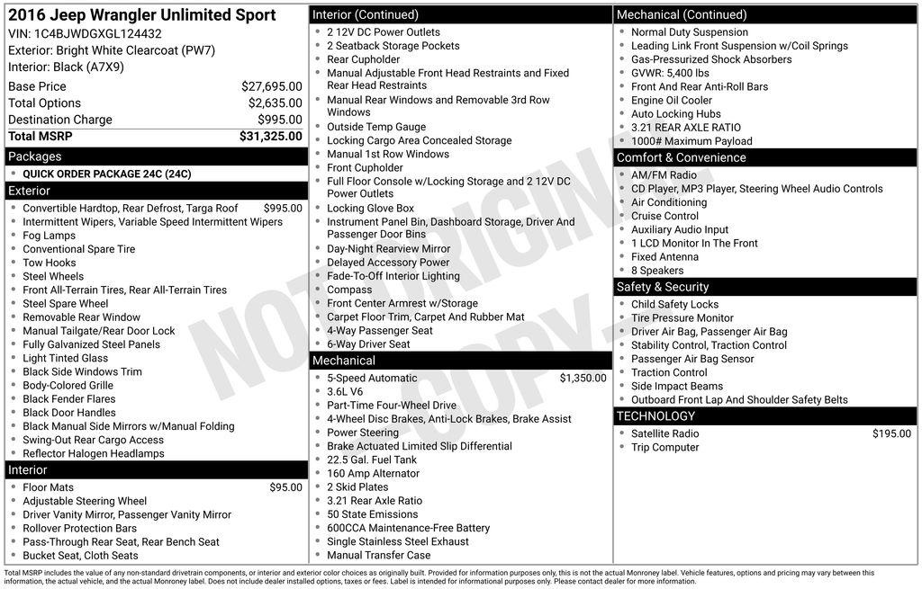 2016 Jeep Wrangler Unlimited Sport Check out all these great option's Quick Order Package 24C, 1-Yr SiriusXM Radio Service, 16"" x 7.0"" Luxury Styled Steel Wheels, 3.21 Rear Axle Ratio, 4-Wheel Disc Brakes, 8 Speakers, ABS brakes, Air Conditioning, AM/FM radio, Audio Jack Input for Mobile Devices, Black 3-Piece Hard Top, Brake assist, CD player, Cloth Seats w/Adjustable Head Restraints, Compass, Delete Sunrider Soft Top, Driver door bin, Driver vanity mirror, Dual front impact airbags, Electronic Stability Control, Freedom Panel Storage Bag, Front anti-roll bar, Front Bucket Seats, Front Center Armrest w/Storage, Front fog lights, Integrated roll-over protection, Low tire pressure warning, MOPAR Slush Mats, Normal Duty Suspension, Occupant sensing airbag, Outside temperature display, Passenger door bin, Passenger vanity mirror, Power steering, Radio: 130, Rear anti-roll bar, Rear Window Defroster, Rear Window Wiper/Washer, SIRIUS Satellite Radio, Speed control, Split folding rear seat, Steering wheel mounted audio controls, Sunrider Soft Top, Tachometer, Tilt steering wheel, Tinted Rear Quarter & Liftgate Windows, Traction control, Trip computer, and Variably intermittent wipers. Recent Arrival!Dealer Detailed, 160 Point Inspection, Recent Oil Change.Toyota of Slidell is the leader in customer service on the North shore. Come experience what a great car dealer can be.For directions to Toyota of Slidell Click belowhttp://www.toyotaofslidell.com/slidell-toyota-directions.htm *Picture may not represent actual vehicle. Price varies based on Trim Levels and Options. Certain vehicles listed may not be available, or may have different prices, or be equipped with dealer installed options. See Dealer for in-stock inventory & actual selling price. All prices plus tax, title & license with approved credit. MSRP includes delivery, processing, and handling fees. Dealer doc fee $425.00 not included in price. Prices may be different outside of each advertised period and do not necessarily reflect cash price at any other time.
