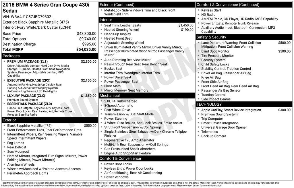 Elevate your driving experience with this meticulously maintained 2018 BMW 4 Series 430i Gran Coupe. This stunning vehicle boasts a sleek black exterior and a wealth of premium features that will captivate your senses and elevate your daily commute.• Executive Package• Luxury Package• Premium Package• harman/kardon Surround Sound System• Head-Up Display• Lumbar Support• Power moonroof• Power Liftgate• Parking Assistant• Automatic High Beams• Icon Adaptive Full LED Headlights• Advanced Real-Time Traffic Information• Instrument Cluster w/Extended Contents• Luxury Line• Remote ServicesPowered by a 2.0L 4-Cylinder DOHC 16V Turbocharged engine and an 8-Speed Automatic Sport transmission, this 430i Gran Coupe delivers an exhilarating driving experience with an impressive 24 city / 34 highway MPG. The rear-wheel-drive configuration and sport-tuned suspension ensure exceptional handling and control, allowing you to navigate the roads with confidence and precision.Step inside and be enveloped in the luxurious cabin, featuring Dakota Leather Upholstery and a host of advanced technologies, including a Navigation System, Hands-Free Bluetooth & USB Audio Connection, and a premium Hi-Fi Sound System. The Heated Front Seats and Heated Steering Wheel will keep you comfortable, while the Parking Assistant and Side & Top View Cameras provide added peace of mind when navigating tight spaces.This 430i Gran Coupe is more than just a stunning vehicle; it's a testament to BMW's commitment to craftsmanship and performance. With its sleek design, powerful engine, and comprehensive suite of features, this car is poised to elevate your driving experience to new heights.We invite you to schedule a test drive and experience the exceptional capabilities of this 2018 BMW 4 Series 430i Gran Coupe for yourself. Let us demonstrate how this remarkable vehicle can enhance your daily commute and elevate your driving pleasure. Contact us today to schedule your appointment and take the first step towards owning a truly remarkable automobile.