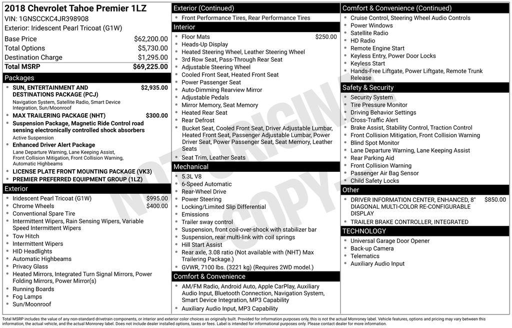 2018 Chevrolet Tahoe Premier Check out all these great option's Enhanced Driver Alert Package (Y86) (Forward Collision Alert, IntelliBeam Headlamps, Lane Keep Assist w/Lane Departure Warning, and Low Speed Forward Automatic Braking), License Plate Front Mounting Package, Magnetic Ride Control Suspension Package, Max Trailering Package (Integrated Trailer Brake Controller), Preferred Equipment Group 1LZ (1st & 2nd Row Color-Keyed Carpeted Floor Mats, 3rd Row 60/40 Power Fold Split-Bench, 4-Wheel Antilock Disc Brakes w/Brake Assist, 5 12-Volt Auxiliary Power Outlets, Auto-Dimming Inside Rear-View Mirror, Black Assist Steps w/Chrome Accent Strip, Bose Centerpoint Premium 10-Speaker Surround Sound, Cargo Net, Color-Keyed Carpeting Floor Covering, Driver Inboard & Front Passenger Airbags, Electronic Cruise Control w/Set & Resume Speed, Floor Console, Fog Lamps, Front & Rear Park Assist, Front Passenger 6-Way Power Seat Adjuster, Hands Free Power Liftgate, Heated & Ventilated Driver & Front Passenger Seats, Heated 2nd Row Seats, Heated Leather Wrapped Steering Wheel, Lane Change Alert w/Side Blind Zone Alert, Memory Settings, OnStar Basic Plan For 5 Years, Passive Entry System, Power Release 2nd Row Bucket Seats, Power Tilt & Telescopic Steering Column, Power-Adjustable Accelerator & Brake Pedals, Power-Folding Heated Outside Mirrors, Push Button Keyless Start, Rear Cross-Traffic Alert, Remote Keyless Entry, Remote Vehicle Start, Roof-Mounted Luggage Rack Side Rails, SiriusXM NavTraffic, SiriusXM Satellite Radio, Universal Home Remote, and Wireless Charging), Sun, Entertainment & Destinations Package (Power Sunroof and Rear Seat Blu-Ray/DVD Entertainment System), 10 Speakers, 1st & 2nd Rows All-Weather Floor Liner (LPO), 3rd row seats: split-bench, 4-Wheel Disc Brakes, ABS brakes, Adaptive suspension, Adjustable pedals, Air Conditioning, Alloy wheels, AM/FM radio: SiriusXM, Apple CarPlay/Android Auto, Auto High-beam Headlights, Auto-dimming door mirrors, Auto-dimming Rear-View mirror, Automatic temperature control, Bluetooth® For Phone, Bodyside moldings, Brake assist, Bumpers: body-color, CD player, Compass, Delay-off headlights, Driver door bin, Driver vanity mirror, Dual front impact airbags, Dual front side impact airbags, Electronic Stability Control, Emergency communication system: OnStar Guidance, Enhanced Driver Information Center, Exterior Parking Camera Rear, Front anti-roll bar, Front Bucket Seats, Front Center Armrest, Front dual zone A/C, Front fog lights, Front Heated Reclining Bucket Seats, Front reading lights, Front wheel independent suspension, Fully automatic headlights, Garage door transmitter, HD Radio, Head-Up Display, Heated door mirrors, Heated front seats, Heated rear seats, Heated steering wheel, High-Intensity Discharge Headlights, Illuminated entry, Low tire pressure warning, Memory seat, Navigation System, Occupant sensing airbag, Outside temperature display, Overhead airbag, Overhead console, Panic alarm, Passenger door bin, Passenger vanity mirror, Pedal memory, Perforated Leather-Appointed Seat Trim, Power door mirrors, Power driver seat, Power Liftgate, Power passenger seat, Power steering, Power windows, Premium audio system: Chevrolet MyLink, Radio: Chevrolet MyLink w/Nav/AM/FM Stereo, Rain sensing wipers, Rear air conditioning, Rear anti-roll bar, Rear reading lights, Rear window defroster, Rear window wiper, Remote keyless entry, Roof rack: rails only, Security system, Single-Slot CD/MP3 Player, Speed control, Speed-sensing steering, Split folding rear seat, Spoiler, Steering wheel memory, Steering wheel mounted audio controls, Tachometer, Telescoping steering wheel, Tilt steering wheel, Traction control, Trip computer, Turn signal indicator mirrors, Variably intermittent wipers, Ventilated front seats, Voltmeter, Wheels: 20"" x 9"" Chrome, and Wheels: 20"" x 9"" Polished-Aluminum. Recent Arrival!Dealer Detailed, 160 Point Inspection, Recent Oil Change.Awards: * JD Power Dependability Study