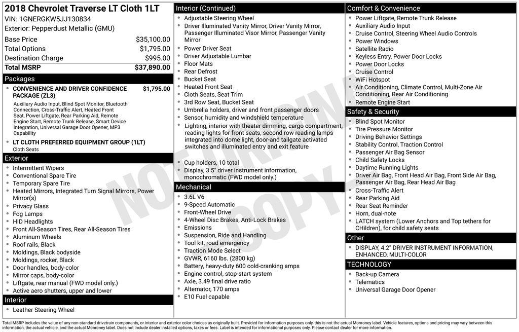 2018 Chevrolet Traverse LT Cloth w/1LT Check out all these great option's Convenience & Driver Confidence Package (4.2"" Multi-Color Enhanced Driver Instrument Display, Heated Driver & Front Passenger Seats, Lane Change Alert w/Side Blind Zone Alert, Radio: Chevrolet MyLink AM/FM Stereo w/8"" Screen, Rear Cross-Traffic Alert, Rear Park Assist w/Audible Warning, Rear Power Liftgate, Remote Start, SiriusXM Satellite Radio, and Universal Home Remote), Preferred Equipment Group 1LT, 3.49 Axle Ratio, 3rd row seats: split-bench, 4-Wheel Disc Brakes, 6 Speakers, 7-Passenger Seating (2-2-3 Seating Configuration), 8-Passenger Seating (2-3-3 Seating Configuration), ABS brakes, Air Conditioning, Alloy wheels, AM/FM radio: SiriusXM, Apple CarPlay/Android Auto, Automatic temperature control, Brake assist, Bumpers: body-color, Compass, Delay-off headlights, Driver door bin, Driver vanity mirror, Dual front impact airbags, Dual front side impact airbags, Electronic Stability Control, Emergency communication system: OnStar Guidance, Exterior Parking Camera Rear, Four wheel independent suspension, Front anti-roll bar, Front Bucket Seats, Front Center Armrest, Front dual zone A/C, Front fog lights, Front reading lights, Fully automatic headlights, Heated door mirrors, High-Intensity Discharge Headlights, Illuminated entry, Low tire pressure warning, Occupant sensing airbag, Outside temperature display, Overhead airbag, Overhead console, Panic alarm, Passenger door bin, Passenger vanity mirror, Power door mirrors, Power driver seat, Power steering, Power windows, Premium Cloth Seat Trim, Radio data system, Radio: Chevrolet MyLink AM/FM Stereo, Rear air conditioning, Rear anti-roll bar, Rear reading lights, Rear window defroster, Rear window wiper, Remote keyless entry, Roof rack: rails only, Security system, Speed control, Speed-sensing steering, Spoiler, Steering wheel mounted audio controls, Tachometer, Telescoping steering wheel, Tilt steering wheel, Traction control, Trip computer, Turn signal indicator mirrors, Variably intermittent wipers, Voltmeter, and Wheels: 18"" Bright Silver Machined Painted Alum. Recent Arrival! 18/27 City/Highway MPGDealer Detailed, 160 Point Inspection, Recent Oil Change.Clean CARFAX.Awards: * JD Power Automotive Performance, Execution and Layout (APEAL) Study * 2018 KBB.com Best Family Cars * 2018 KBB.com 10 Most Affordable 3-Row Vehicles * 2018 KBB.com 10 Most Awarded BrandsToyota of Slidell is the leader in customer service on the North shore. Come experience what a great car dealer can be.For directions to Toyota of Slidell Click belowhttp://www.toyotaofslidell.com/slidell-toyota-directions.htm *Picture may not represent actual vehicle. Price varies based on Trim Levels and Options. Certain vehicles listed may not be available, or may have different prices, or be equipped with dealer installed options. See Dealer for in-stock inventory & actual selling price. All prices plus tax, title & license with approved credit. MSRP includes delivery, processing, and handling fees. Dealer doc fee $425.00 not included in price. Prices may be different outside of each advertised period and do not necessarily reflect cash price at any other time.