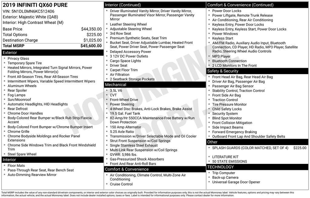 Discover the perfect blend of luxury and versatility in this 2019 INFINITI QX60 PURE. This exceptional SUV boasts a captivating white exterior and a meticulously maintained interior, making it the ideal choice for the discerning driver.Elevate your driving experience with the following premium features:- Dealer Detailed- 160 Point Inspection- Recent Oil Change- SPLASH GUARDS (COLOR MATCHED, SET OF 4)Beyond these thoughtful additions, the QX60 PURE comes equipped with an impressive array of advanced technologies and premium amenities. Enjoy the comfort of automatic climate control, the convenience of a power liftgate, and the seamless connectivity of the state-of-the-art infotainment system.Powered by a robust 3.5L V6 engine and paired with a smooth-shifting CVT transmission, this front-wheel-drive SUV delivers exceptional performance and efficiency, with an EPA-estimated 20 city/27 highway MPG. Whether navigating city streets or embarking on road trips, the QX60 PURE provides a refined and confident driving experience.Discover the perfect balance of style, comfort, and capability in this 2019 INFINITI QX60 PURE. With its well-appointed interior, advanced safety features, and impressive performance, this SUV is the perfect companion for your adventures. Experience the difference for yourself by scheduling a test drive today.