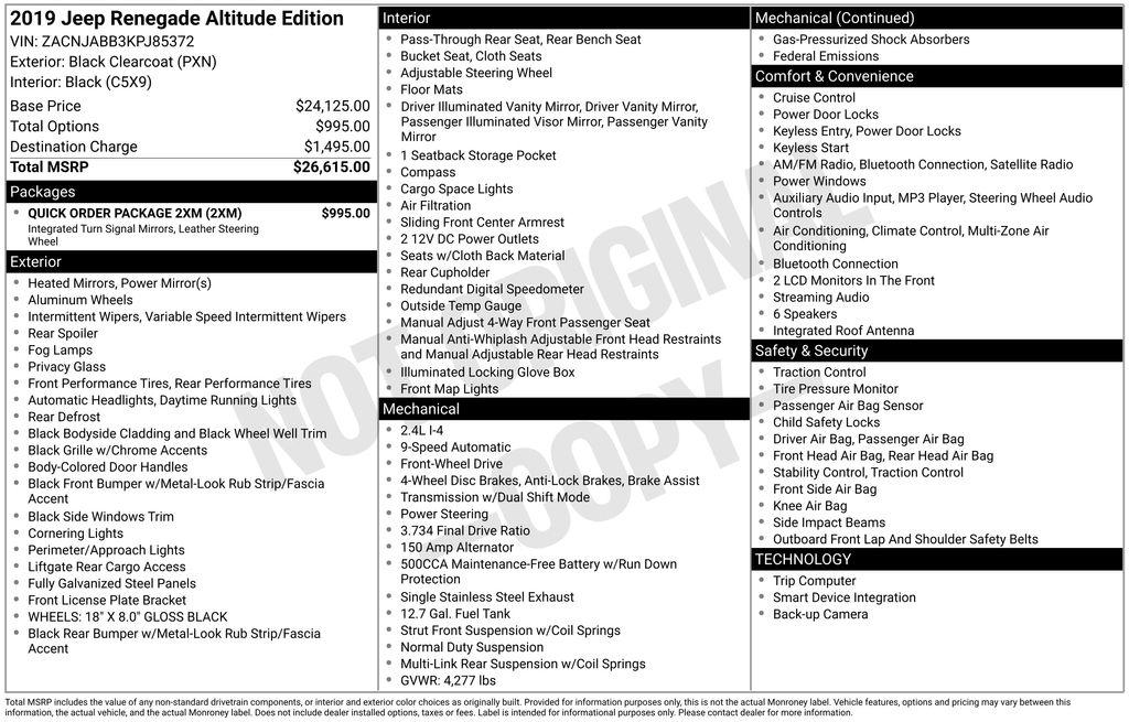 2019 Jeep Renegade Latitude Check out all these great option's Altitude Package, Quick Order Package 2XM (Black Accent Stitching, Deluxe Cloth High-Back Bucket Seats, Exterior Mirrors w/Supplemental Signals, Gloss Black Exterior Accents, Leather Wrapped Steering Wheel, Vinyl Door Trim Panel, and Wheels: 17"" x 7"" Gloss Black), 17"" x 7.0"" Aluminum Wheels, 3.734 Final Drive Ratio, 4-Wheel Disc Brakes, 6 Speakers, ABS brakes, Air Conditioning, Alloy wheels, AM/FM radio: SiriusXM, Anti-whiplash front head restraints, Apple CarPlay/Android Auto, Automatic temperature control, Brake assist, Compass, Delay-off headlights, Driver door bin, Driver vanity mirror, Dual front impact airbags, Dual front side impact airbags, Electronic Stability Control, Four wheel independent suspension, Front anti-roll bar, Front Bucket Seats, Front Center Armrest, Front dual zone A/C, Front fog lights, Front reading lights, Fully automatic headlights, Heated door mirrors, Illuminated entry, Knee airbag, Low tire pressure warning, Manual Adjust 4-Way Front Passenger Seat, Normal Duty Suspension, Occupant sensing airbag, Outside temperature display, Overhead airbag, Panic alarm, ParkView Rear Back-Up Camera, Passenger door bin, Passenger vanity mirror, Power door mirrors, Power steering, Power windows, Premium Cloth Bucket Seats, Radio data system, Radio: Uconnect 4 w/7"" Display, Rear anti-roll bar, Rear window defroster, Rear window wiper, Remote keyless entry, Roof rack: rails only, Speed control, Split folding rear seat, Spoiler, Steering wheel mounted audio controls, Tachometer, Telescoping steering wheel, Tilt steering wheel, Traction control, Trip computer, Variably intermittent wipers, Voltmeter, and Wheels: 18"" x 8.0"" Gloss Black (DISC) Recent Arrival! 22/30 City/Highway MPGDealer Detailed, 160 Point Inspection, Recent Oil Change.Toyota of Slidell is the leader in customer service on the North shore. Come experience what a great car dealer can be.For directions to Toyota of Slidell Click belowhttp://www.toyotaofslidell.com/slidell-toyota-directions.htm *Picture may not represent actual vehicle. Price varies based on Trim Levels and Options. Certain vehicles listed may not be available, or may have different prices, or be equipped with dealer installed options. See Dealer for in-stock inventory & actual selling price. All prices plus tax, title & license with approved credit. MSRP includes delivery, processing, and handling fees. Dealer doc fee $425.00 not included in price. Prices may be different outside of each advertised period and do not necessarily reflect cash price at any other time.