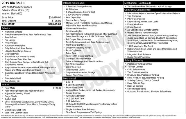 2019 Kia Soul Plus Check out all these great option's 17"" Alloy Wheels, 4-Wheel Disc Brakes, 6 Speakers, 6-Way Adjustable Driver's Seat, ABS brakes, Air Conditioning, Alloy wheels, AM/FM radio: SiriusXM, Apple CarPlay & Android Auto, Automatic temperature control, Brake assist, Bumpers: body-color, Carpeted Floor Mat, Cloth Seat Trim, Driver door bin, Driver vanity mirror, Dual front impact airbags, Dual front side impact airbags, Electronic Stability Control, Emergency communication system, Exterior Parking Camera Rear, Front anti-roll bar, Front Bucket Seats, Front Center Armrest, Front fog lights, Front reading lights, Front wheel independent suspension, Fully automatic headlights, Heated door mirrors, Illuminated entry, Low tire pressure warning, Occupant sensing airbag, Outside temperature display, Overhead airbag, Overhead console, Panic alarm, Passenger door bin, Passenger vanity mirror, Power door mirrors, Power steering, Power windows, Radio: AM/FM/MP3 Audio System, Rear seat center armrest, Rear window defroster, Rear window wiper, Remote keyless entry, Speed control, Speed-sensing steering, Split folding rear seat, Steering wheel mounted audio controls, Tachometer, Telescoping steering wheel, Tilt steering wheel, Traction control, Trip computer, and Variably intermittent wipers. Recent Arrival! 25/30 City/Highway MPGDealer Detailed, 160 Point Inspection, Recent Oil Change.Clean CARFAX.Awards: * 2019 KBB.com 5-Year Cost to Own Awards * 2019 KBB.com 10 Coolest New Cars Under $20,000Toyota of Slidell is the leader in customer service on the North shore. Come experience what a great car dealer can be.For directions to Toyota of Slidell Click belowhttp://www.toyotaofslidell.com/slidell-toyota-directions.htm *Picture may not represent actual vehicle. Price varies based on Trim Levels and Options. Certain vehicles listed may not be available, or may have different prices, or be equipped with dealer installed options. See Dealer for in-stock inventory & actual selling price. All prices plus tax, title & license with approved credit. MSRP includes delivery, processing, and handling fees. Dealer doc fee $425.00 not included in price. Prices may be different outside of each advertised period and do not necessarily reflect cash price at any other time.