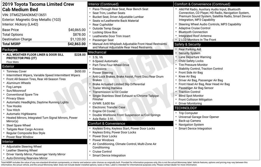 Elevate your driving experience with this exceptional 2019 Toyota Tacoma Limited V6. Boasting a powerful 3.5L V6 engine, this truck delivers an impressive 278 horsepower, ensuring a thrilling and capable performance on any terrain. Equipped with 4-wheel drive, you'll conquer the toughest challenges with ease, while the 6-speed automatic transmission provides seamless and responsive power delivery.- Hard Tri-Fold Tonneau Cover- All Weather Floor Liner & Door Sill Protector Package- Front Dual Zone A/C- Remote Keyless Entry- Active Cruise Control- Electronic Stability Control- Traction Control- Illuminated Entry- Navigation System- ABS Brakes- Leather Seat Trim- Power Moonroof- Alloy WheelsBeyond its impressive capabilities, this Tacoma Limited V6 is packed with a wealth of premium features designed to enhance your driving experience. Enjoy the convenience of dual-zone automatic climate control, remote keyless entry, and the advanced navigation system that will guide you to your destination with ease. The leather-trimmed interior and power moonroof add an extra touch of luxury, while the alloy wheels and sleek exterior styling give this truck a refined and sophisticated appearance.Safety is also a top priority, with features like electronic stability control, traction control, and ABS brakes ensuring a secure and confident driving experience. The low tire pressure warning system and illuminated entry further contribute to your peace of mind behind the wheel.Whether you're tackling tough terrain or navigating the daily commute, this 2019 Toyota Tacoma Limited V6 is the perfect companion. Its powerful engine, capable 4-wheel drive system, and wealth of premium features make it a standout choice in the midsize truck segment. Experience the difference for yourself and schedule a test drive today. We're confident you'll be impressed by the Tacoma's uncompromising performance and refined sophistication.