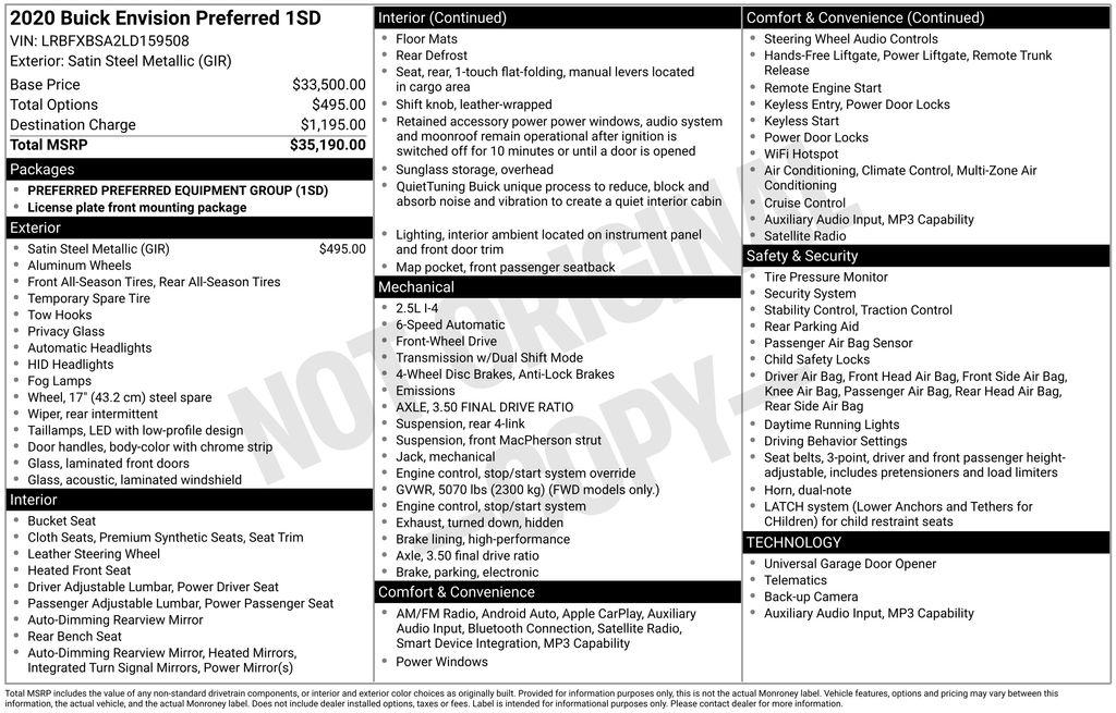 2020 Buick Envision Preferred Check out all these great option's Preferred Equipment Group 1SD, 3.50 Final Drive Axle Ratio, 4-Wheel Disc Brakes, 6 Speakers, 6-Speaker Audio System Feature, ABS brakes, Air Conditioning, Alloy wheels, AM/FM radio: SiriusXM, Apple CarPlay/Android Auto, Auto-dimming door mirrors, Auto-dimming Rear-View mirror, Automatic temperature control, Brake assist, Bumpers: body-color, Cloth w/Leatherette Seat Trim, Compass, Delay-off headlights, Driver 8-Way Power Seat Adjuster, Driver door bin, Driver vanity mirror, Dual front impact airbags, Dual front side impact airbags, Dual USB Charging-Only Ports, Dual USB Ports w/Single Auxiliary Input Jack, Electronic Stability Control, Emergency communication system: OnStar and Buick connected services capable, Exterior Parking Camera Rear, Four wheel independent suspension, Front anti-roll bar, Front Bucket Seats, Front Center Armrest, Front dual zone A/C, Front fog lights, Front Passenger 8-Way Power Seat Adjuster, Front reading lights, Fully automatic headlights, Garage door transmitter, Heated door mirrors, Heated Driver & Front Passenger Seats, Heated front seats, High-Intensity Discharge Headlights, Illuminated entry, Knee airbag, Leather Shift Knob, Low tire pressure warning, Occupant sensing airbag, Outside temperature display, Overhead airbag, Overhead console, Panic alarm, Passenger door bin, Passenger vanity mirror, Power door mirrors, Power driver seat, Power Liftgate, Power passenger seat, Power steering, Power windows, Radio data system, Radio: Buick Infotainment System AM/FM Stereo, Rear anti-roll bar, Rear reading lights, Rear seat center armrest, Rear side impact airbag, Rear window defroster, Rear window wiper, Remote keyless entry, Security system, SiriusXM Radio, Speed control, Speed-sensing steering, Split folding rear seat, Spoiler, Steering wheel mounted audio controls, Tachometer, Telescoping steering wheel, Tilt steering wheel, Traction control, Trip computer, Turn signal indicator mirrors, Variably intermittent wipers, and Wheels: 18"" 10-Spoke Painted Aluminum. Recent Arrival! 22/29 City/Highway MPGDealer Detailed, 160 Point Inspection, Recent Oil Change.Clean CARFAX.Toyota of Slidell is the leader in customer service on the North shore. Come experience what a great car dealer can be.For directions to Toyota of Slidell Click belowhttp://www.toyotaofslidell.com/slidell-toyota-directions.htm *Picture may not represent actual vehicle. Price varies based on Trim Levels and Options. Certain vehicles listed may not be available, or may have different prices, or be equipped with dealer installed options. See Dealer for in-stock inventory & actual selling price. All prices plus tax, title & license with approved credit. MSRP includes delivery, processing, and handling fees. Dealer doc fee $425.00 not included in price. Prices may be different outside of each advertised period and do not necessarily reflect cash price at any other time.