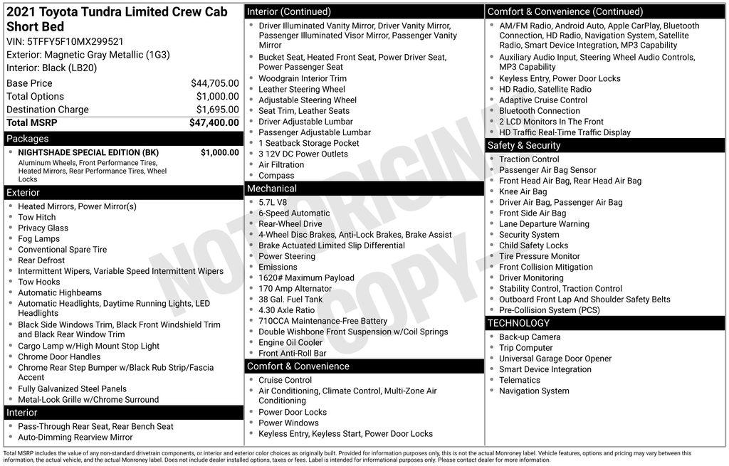 Discover the power and versatility of the 2021 Toyota Tundra Limited. This impressive full-size truck is ready to take on any challenge, whether you're hauling heavy loads, navigating rough terrain, or simply enjoying the open road.- 160 Point Inspection- Dealer Detailed- Recent Oil Change- NIGHTSHADE SPECIAL EDITION- Black door handles, black badging, black tip exhaust tail pipe & diffuser, heated power mirrors with black caps, 20"" black alloy wheels, darkened chrome grilleBeneath the bold exterior lies a true workhorse. The i-Force 5.7L V8 engine delivers exceptional power and performance, while the 6-speed automatic transmission with overdrive ensures smooth, efficient operation. With rear-wheel drive and a towing capacity of up to 10,200 lbs, this Tundra is ready to handle your toughest jobs.The interior of the Tundra Limited is designed with your comfort and convenience in mind. Enjoy the premium audio system with SiriusXM, dynamic navigation, and Apple CarPlay/Android Auto integration. Stay connected with the latest technology, including a rearview camera, HomeLink garage door opener, and remote keyless entry.Slip into the heated front bucket seats, surrounded by premium leather trim and a host of amenities. The power driver's seat and telescoping steering wheel allow you to find your perfect driving position, while the dual-zone automatic climate control keeps you and your passengers comfortable.Safety is also a top priority in the Tundra Limited. With features like Toyota Safety Sense, including pre-collision system with pedestrian detection, lane departure alert, and automatic high beams, you can drive with confidence. The advanced airbag system and electronic stability control further enhance your protection on the road.Whether you're tackling tough jobs or embarking on weekend adventures, the 2021 Toyota Tundra Limited is the perfect companion. Experience the power, capability, and comfort that make this truck a true standout in the full-size segment. Visit our showroom today to take this impressive Tundra for a test drive and discover why it's the perfect choice for your next vehicle.