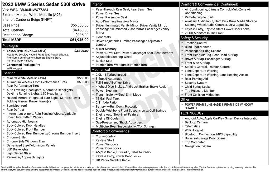 Experience the pinnacle of luxury and performance with this exceptional 2022 BMW 5 Series 530i xDrive. Boasting a sleek and sophisticated White exterior, this vehicle is a true testament to BMW's engineering excellence.Packed with an impressive array of premium features, this 5 Series delivers an unparalleled driving experience. Highlights include:• Executive Package: Remote Engine Start, Ceramic Controls, Head-Up Display, harman/kardon Surround Sound System, Power Tailgate, Power Rear Sunshade & Rear Side Window Shades, Gesture Control, Heated Front Seats• M Sport Package: Aluminum Rhombicle Smoke Grey Trim, Shadowline Exterior Trim, 19"" M Y-Spoke Bicolor Jet Black Wheels, M Steering Wheel, M Sport Suspension, Aerodynamic Kit• 19"" W-Spoke Bi-Color WheelsThe 2.0L 4-Cylinder engine, paired with an 8-Speed Automatic Sport transmission and BMW's renowned xDrive all-wheel-drive system, delivers a thrilling and responsive driving experience. With an impressive 23 city / 32 highway MPG, this 5 Series offers exceptional efficiency without compromising on power.Stepping inside, you'll be greeted by a cabin that exudes luxury and sophistication. The Perforated Sensatec upholstery, coupled with the power-adjustable front seats and heated function, ensures unparalleled comfort. The Live Cockpit Pro with Navigation system, along with the ConnectedDrive Services, keep you connected and informed on the road.Safety and technology are also at the forefront, with features like the Rear-View Camera, Blind Spot Monitoring, and the comprehensive BMW Assist eCall system providing you with peace of mind.This 2022 BMW 5 Series 530i xDrive is a true masterpiece of German engineering, blending dynamic performance, exceptional luxury, and cutting-edge technology. Experience the ultimate driving pleasure and schedule a test drive today. We're confident you'll be captivated by this exceptional vehicle.
