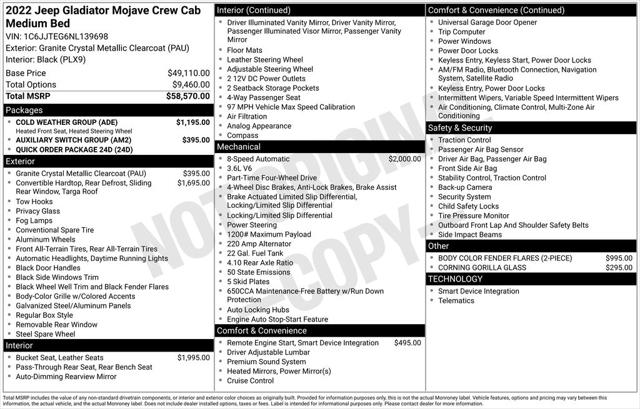 2022 Jeep Gladiator Mojave Check out all these great option's Auxiliary Switch Group (240 Amp Alternator, 700 Amp Maintenance Free Battery, and Auxiliary Switches), Cold Weather Group (Heated Front Seats and Heated Steering Wheel), Quick Order Package 24D, 4-Wheel Disc Brakes, 4.10 Rear Axle Ratio, 9 Speakers, 97 MPH Vehicle Max Speed Calibration, ABS brakes, Air Conditioning, Alloy wheels, AM/FM radio: SiriusXM, Apple CarPlay/Android Auto, Auto-dimming Rear-View mirror, Automatic temperature control, Black 3-Piece Hard Top, Body Color Fender Flares (2-Piece), Brake assist, Compass, Corning Gorilla Glass, Delay-off headlights, Driver door bin, Driver vanity mirror, Dual front impact airbags, Dual front side impact airbags, Electronic Stability Control, Emergency communication system: SiriusXM Guardian, Freedom Panel Storage Bag, Front anti-roll bar, Front Bucket Seats, Front Center Armrest w/Storage, Front dual zone A/C, Front fog lights, Front reading lights, Fully automatic headlights, Garage door transmitter, Heated door mirrors, Heavy Duty Suspension w/Gas Shocks, Illuminated entry, Integrated roll-over protection, Leather steering wheel, Low tire pressure warning, Navigation System, Occupant sensing airbag, Outside temperature display, Panic alarm, ParkView Rear Back-Up Camera, Passenger door bin, Passenger vanity mirror, Power door mirrors, Power steering, Power windows, Premium Cloth Seats w/Sport Bolsters, Radio data system, Radio: Uconnect 4C Nav w/8.4"" Display, Rear anti-roll bar, Rear reading lights, Rear Sliding Window, Rear Window Defroster, Remote keyless entry, Remote Start System, Security system, Speed control, Split folding rear seat, Steering wheel mounted audio controls, Tachometer, Telescoping steering wheel, Tilt steering wheel, Traction control, Trip computer, Variably intermittent wipers, Voltmeter, and Wheels: 17"" x 7.5"" Low Gloss Black Aluminum. Recent Arrival!Dealer Detailed, 160 Point Inspection, Recent Oil Change. Priced below KBB Fair Purchase Price!CARFAX One-Owner. Clean CARFAX.Toyota of Slidell is the leader in customer service on the North shore. Come experience what a great car dealer can be.For directions to Toyota of Slidell Click belowhttp://www.toyotaofslidell.com/slidell-toyota-directions.htm *Picture may not represent actual vehicle. Price varies based on Trim Levels and Options. Certain vehicles listed may not be available, or may have different prices, or be equipped with dealer installed options. See Dealer for in-stock inventory & actual selling price. All prices plus tax, title & license with approved credit. MSRP includes delivery, processing, and handling fees. Dealer doc fee $425.00 not included in price. Prices may be different outside of each advertised period and do not necessarily reflect cash price at any other time.