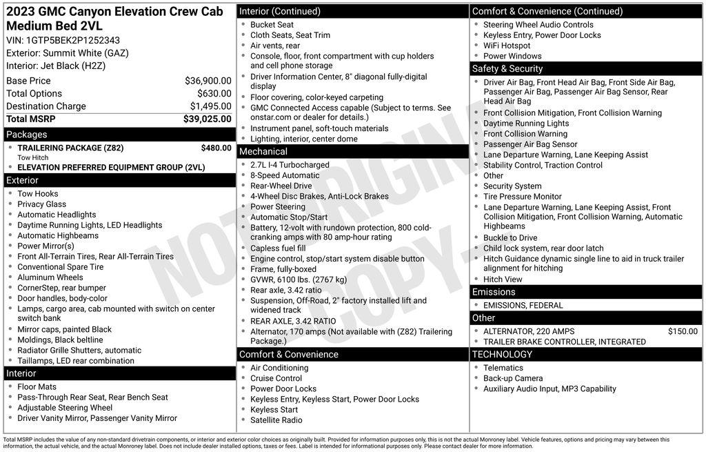 2023 GMC Canyon Elevation Check out all these great option's Preferred Equipment Group 2VL (Automatic Emergency Braking, Canyon Pro Safety, Following Distance Indicator, Forward Collision Alert, Front Pedestrian & Bicyclist Braking, IntelliBeam Automatic High Beam On/Off, and Lane Keep Assist w/Lane Departure Warning), Trailering Package (Integrated Trailer Brake Controller), 1 Rear USB Ports in Center Console (Charge-Only), 2 1st Row USB Charge/Data Ports, 220 Amps Alternator, 3.42 Rear Axle Ratio, 4-Way Manual Front Passenger Seat Adjuster, 4-Wheel Disc Brakes, 6 Speakers, 6-Speaker Audio System Feature, 6-Way Manual Driver Seat Adjuster, ABS brakes, Air Conditioning, Alloy wheels, AM/FM radio: SiriusXM, Apple CarPlay/Android Auto, Auto High-beam Headlights, Automatic Stop/Start, Brake assist, Bumpers: body-color, Cloth Seat Trim, Compass, Delay-off headlights, Driver door bin, Driver vanity mirror, Dual front impact airbags, Dual front side impact airbags, Electronic Stability Control, Front anti-roll bar, Front Bucket Seats, Front Center Armrest, Front Passenger Seatback Map Pocket, Front wheel independent suspension, Illuminated entry, Low tire pressure warning, Navigation System, Occupant sensing airbag, Outside temperature display, Overhead airbag, Overhead console, Panic alarm, Passenger door bin, Passenger vanity mirror, Power door mirrors, Power steering, Power windows, Radio data system, Radio: 11.3"" Diagonal Premium GMC Infotainment Sys, Rear reading lights, Rear step bumper, Remote keyless entry, Security system, SiriusXM w/360L, Speed control, Speed-sensing steering, Split folding rear seat, Steering wheel mounted audio controls, Stop/Start System Disable Button Engine Control, Tachometer, Tilt steering wheel, Traction control, Trip computer, Variably intermittent wipers, Wheels: 18"" x 8.5"" Dark Gray Painted Aluminum, and Wireless Apple CarPlay/Wireless Android Auto. Recent Arrival!Dealer Detailed, 160 Point Inspection, Recent Oil Change.Odometer is 4620 miles below market average! Clean CARFAX.Toyota of Slidell is the leader in customer service on the North shore. Come experience what a great car dealer can be.For directions to Toyota of Slidell Click belowhttp://www.toyotaofslidell.com/slidell-toyota-directions.htm *Picture may not represent actual vehicle. Price varies based on Trim Levels and Options. Certain vehicles listed may not be available, or may have different prices, or be equipped with dealer installed options. See Dealer for in-stock inventory & actual selling price. All prices plus tax, title & license with approved credit. MSRP includes delivery, processing, and handling fees. Dealer doc fee $425.00 not included in price. Prices may be different outside of each advertised period and do not necessarily reflect cash price at any other time.