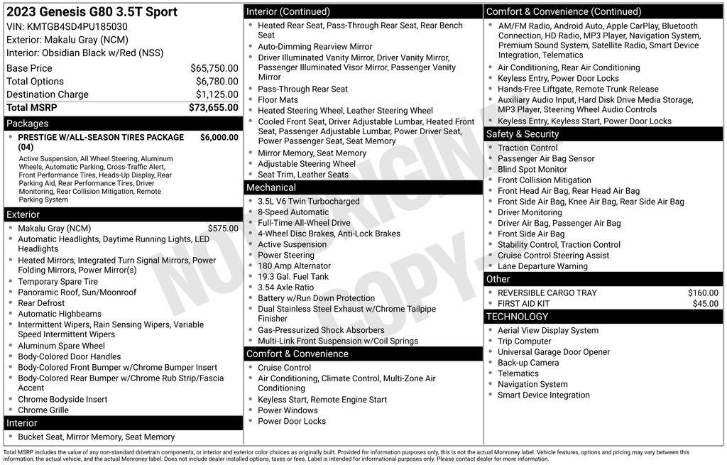 2023 Genesis G80 3.5T Check out all these great option's Prestige w/All-Season Tires Package (12.3"" 3D Digital Instrument Cluster, Carbon Fiber Trim, Electronically Controlled Suspension, Forward Attention Warning, Heads-Up Display, Microfiber Suede Headliner & Pillars, Nappa Leather Seating Surfaces, Option Group 04, Rear Wheel Steering, Remote Smart Parking Assist, Reverse Parking Collision - Avoidance Assist, and Wheels: 20""x8.5J Fr & 20""x9.5J Rr Sport Alloy), 21 Speakers, 4-Wheel Disc Brakes, ABS brakes, Adaptive suspension, Air Conditioning, Alloy wheels, AM/FM radio: SiriusXM, Android Auto & Apple CarPlay, Anti-whiplash front head restraints, Auto High-beam Headlights, Auto tilt-away steering wheel, Auto-dimming door mirrors, Auto-dimming Rear-View mirror, Automatic temperature control, Bumpers: body-color, Compass, Delay-off headlights, Driver door bin, Driver vanity mirror, Dual front impact airbags, Dual front side impact airbags, Electronic Stability Control, Emergency communication system: Genesis Connected Services, Exterior Parking Camera Rear, First Aid Kit, Four wheel independent suspension, Front anti-roll bar, Front Bucket Seats, Front Center Armrest, Front dual zone A/C, Front Passenger Seat Walk-In Device, Front reading lights, Fully automatic headlights, Garage door transmitter: HomeLink, Heated & Ventilated Front Bucket Seats, Heated door mirrors, Heated front seats, Heated rear seats, Heated steering wheel, Illuminated entry, Knee airbag, Leather Seating Surfaces, Leather steering wheel, Low tire pressure warning, Memory seat, Navigation System, Occupant sensing airbag, Outside temperature display, Overhead airbag, Overhead console, Panic alarm, Passenger door bin, Passenger vanity mirror, Power door mirrors, Power driver seat, Power moonroof, Power passenger seat, Power steering, Power windows, Radio data system, Radio: AM/FM/HD/SiriusXM Lexicon Audio System, Rain sensing wipers, Rear air conditioning, Rear anti-roll bar, Rear reading lights, Rear seat center armrest, Rear side impact airbag, Rear Window Blind, Rear window defroster, Remote keyless entry, Reversible Cargo Tray, Security system, Speed control, Speed-sensing steering, Speed-Sensitive Wipers, Steering wheel memory, Steering wheel mounted audio controls, Tachometer, Telescoping steering wheel, Tilt steering wheel, Traction control, Trip computer, Turn signal indicator mirrors, Variably intermittent wipers, Ventilated front seats, and Wheels: 19""x8.5J Fr & 19""x9.5J Rr Alloy. Recent Arrival!Dealer Detailed, 160 Point Inspection, Recent Oil Change. Priced below KBB Fair Purchase Price!CARFAX One-Owner. Clean CARFAX.Toyota of Slidell is the leader in customer service on the North shore. Come experience what a great car dealer can be.For directions to Toyota of Slidell Click belowhttp://www.toyotaofslidell.com/slidell-toyota-directions.htm *Picture may not represent actual vehicle. Price varies based on Trim Levels and Options. Certain vehicles listed may not be available, or may have different prices, or be equipped with dealer installed options. See Dealer for in-stock inventory & actual selling price. All prices plus tax, title & license with approved credit. MSRP includes delivery, processing, and handling fees. Dealer doc fee $425.00 not included in price. Prices may be different outside of each advertised period and do not necessarily reflect cash price at any other time.