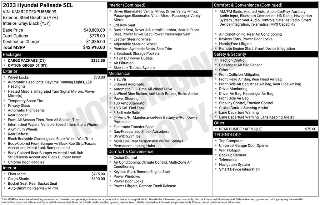 2023 Hyundai Palisade SEL Check out all these great option's Cargo Package (Cargo Blocks, Cargo Net, and Cargo Tray), Option Group 01, 3.648 Axle Ratio, 3rd row seats: split-bench, 4-Wheel Disc Brakes, 6 Speakers, ABS brakes, Air Conditioning, Alloy wheels, AM/FM radio: SiriusXM, Apple CarPlay & Android Auto, Auto High-beam Headlights, Auto-dimming door mirrors, Auto-dimming Rear-View mirror, Automatic temperature control, Brake assist, Bumpers: body-color, Cargo Cover/Screen, Carpeted Floor Mats, Delay-off headlights, Driver door bin, Driver vanity mirror, Dual front impact airbags, Dual front side impact airbags, Electronic Stability Control, Emergency communication system: Blue Link Connected Car Service (3-year complimentary subscription), Exterior Parking Camera Rear, Four wheel independent suspension, Front anti-roll bar, Front Bucket Seats, Front Center Armrest, Front dual zone A/C, Front reading lights, Fully automatic headlights, Garage door transmitter: HomeLink, H-Tex Leatherette Seat Trim, Heated door mirrors, Heated Front Bucket Seats, Heated front seats, Illuminated entry, Knee airbag, Low tire pressure warning, Navigation System, Occupant sensing airbag, Outside temperature display, Overhead airbag, Overhead console, Panic alarm, Passenger door bin, Passenger vanity mirror, Power door mirrors, Power driver seat, Power Liftgate, Power passenger seat, Power steering, Power windows, Radio data system, Radio: AM/FM/MP3 Audio System, Rear air conditioning, Rear anti-roll bar, Rear audio controls, Rear Bumper Applique, Rear reading lights, Rear side impact airbag, Rear window defroster, Rear window wiper, Reclining 3rd row seat, Remote keyless entry, Security system, Speed control, Speed-sensing steering, Split folding rear seat, Spoiler, Steering wheel mounted audio controls, Tachometer, Telescoping steering wheel, Tilt steering wheel, Traction control, Trip computer, Turn signal indicator mirrors, Variably intermittent wipers, Wheel Locks, and Wheels: 18"" x 7.5J Machine-Faced Alloy. Recent Arrival!Dealer Detailed, 160 Point Inspection, Recent Oil Change.Toyota of Slidell is the leader in customer service on the North shore. Come experience what a great car dealer can be.For directions to Toyota of Slidell Click belowhttp://www.toyotaofslidell.com/slidell-toyota-directions.htm *Picture may not represent actual vehicle. Price varies based on Trim Levels and Options. Certain vehicles listed may not be available, or may have different prices, or be equipped with dealer installed options. See Dealer for in-stock inventory & actual selling price. All prices plus tax, title & license with approved credit. MSRP includes delivery, processing, and handling fees. Dealer doc fee $425.00 not included in price. Prices may be different outside of each advertised period and do not necessarily reflect cash price at any other time.