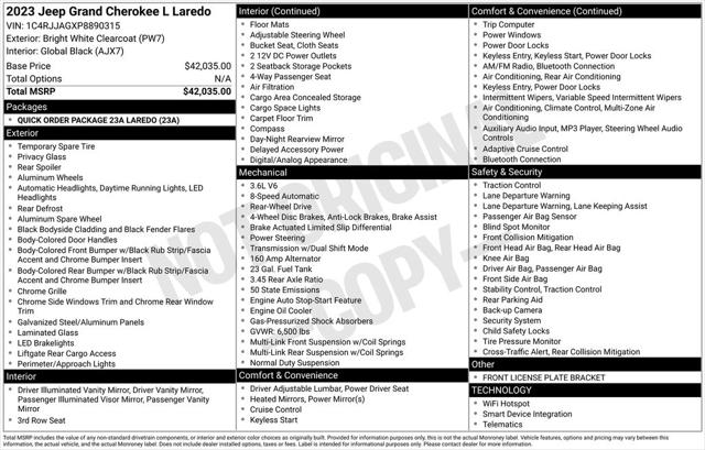 2023 Jeep Grand Cherokee L Laredo Check out all these great option's Quick Order Package 23A Laredo, 3.45 Rear Axle Ratio, 3rd row seats: split-bench, 4-Wheel Disc Brakes, 6 Speakers, ABS brakes, Air Conditioning, Alloy wheels, Anti-whiplash front head restraints, Automatic temperature control, Brake assist, Bumpers: body-color, Cloth Seats, Compass, Delay-off headlights, Driver door bin, Driver vanity mirror, Dual front impact airbags, Dual front side impact airbags, Electronic Stability Control, Emergency communication system, Four wheel independent suspension, Front anti-roll bar, Front Bucket Seats, Front Center Armrest w/Storage, Front dual zone A/C, Front License Plate Bracket, Front reading lights, Fully automatic headlights, Heated door mirrors, Illuminated entry, Knee airbag, Low tire pressure warning, Manual Fold Seatbacks, Molded In Color Black/Gloss Black Roof Rails, Normal Duty Suspension, Occupant sensing airbag, Outside temperature display, Overhead airbag, Overhead console, Panic alarm, ParkView Rear Back-Up Camera, Passenger door bin, Passenger vanity mirror, Power door mirrors, Power driver seat, Power steering, Power windows, Radio data system, Radio: Uconnect 5 w/8.4"" Display, Rear air conditioning, Rear anti-roll bar, Rear reading lights, Rear window defroster, Rear window wiper, Reclining 3rd row seat, Remote keyless entry, Security system, Speed control, Speed-Sensitive Wipers, Split folding rear seat, Spoiler, Steering wheel mounted audio controls, Tachometer, Telescoping steering wheel, Tilt steering wheel, Traction control, Trip computer, Variably intermittent wipers, Voltmeter, and Wheels: 18"" x 8.0"" Fully Painted Aluminum. Recent Arrival! 19/26 City/Highway MPGDealer Detailed, 160 Point Inspection, Recent Oil Change.Odometer is 2477 miles below market average! Clean CARFAX.Toyota of Slidell is the leader in customer service on the North shore. Come experience what a great car dealer can be.For directions to Toyota of Slidell Click belowhttp://www.toyotaofslidell.com/slidell-toyota-directions.htm *Picture may not represent actual vehicle. Price varies based on Trim Levels and Options. Certain vehicles listed may not be available, or may have different prices, or be equipped with dealer installed options. See Dealer for in-stock inventory & actual selling price. All prices plus tax, title & license with approved credit. MSRP includes delivery, processing, and handling fees. Dealer doc fee $425.00 not included in price. Prices may be different outside of each advertised period and do not necessarily reflect cash price at any other time.