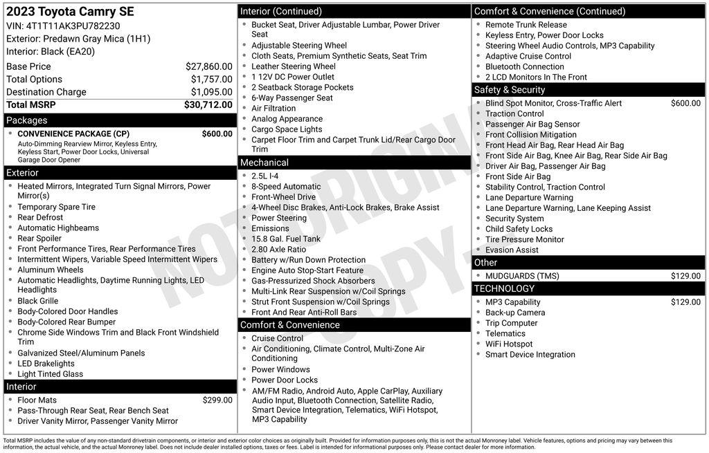 2023 Toyota Camry SE Check out all these great option's ABS brakes, Active Cruise Control, Alloy wheels, Electronic Stability Control, Front dual zone A/C, Heated door mirrors, Illuminated entry, Low tire pressure warning, Remote keyless entry, Traction control, 4-Wheel Disc Brakes, 6 Speakers, 8.0J x 18"" Alloy Wheels, Air Conditioning, AM/FM radio: SiriusXM, Apple CarPlay/Android Auto, Auto High-beam Headlights, Automatic temperature control, Brake assist, Bumpers: body-color, Delay-off headlights, Driver door bin, Driver vanity mirror, Dual front impact airbags, Dual front side impact airbags, Emergency communication system: Safety Connect (1-year trial), Exterior Parking Camera Rear, Four wheel independent suspension, Front anti-roll bar, Front Bucket Seats, Front Center Armrest, Front reading lights, Fully automatic headlights, Knee airbag, Leather steering wheel, Occupant sensing airbag, Outside temperature display, Overhead airbag, Overhead console, Panic alarm, Passenger door bin, Passenger vanity mirror, Power door mirrors, Power driver seat, Power steering, Power windows, Radio data system, Radio: Audio, Rear anti-roll bar, Rear seat center armrest, Rear side impact airbag, Rear window defroster, Security system, Speed control, Speed-sensing steering, Split folding rear seat, Spoiler, Sport SofTex Seat Trim w/Fabric Inserts, Steering wheel mounted audio controls, Tachometer, Telescoping steering wheel, Tilt steering wheel, Trip computer, Turn signal indicator mirrors, and Variably intermittent wipers. Recent Arrival! 28/39 City/Highway MPGABS brakes, Active Cruise Control, Alloy wheels, Electronic Stability Control, Front dual zone A/C, Heated door mirrors, Illuminated entry, Low tire pressure warning, Remote keyless entry, Traction control.CARFAX One-Owner.Toyota of Slidell is the leader in customer service on the North shore. Come experience what a great car dealer can be.For directions to Toyota of Slidell Click belowhttp://www.toyotaofslidell.com/slidell-toyota-directions.htm *Picture may not represent actual vehicle. Price varies based on Trim Levels and Options. Certain vehicles listed may not be available, or may have different prices, or be equipped with dealer installed options. See Dealer for in-stock inventory & actual selling price. All prices plus tax, title & license with approved credit. MSRP includes delivery, processing, and handling fees. Dealer doc fee $425.00 not included in price. Prices may be different outside of each advertised period and do not necessarily reflect cash price at any other time.