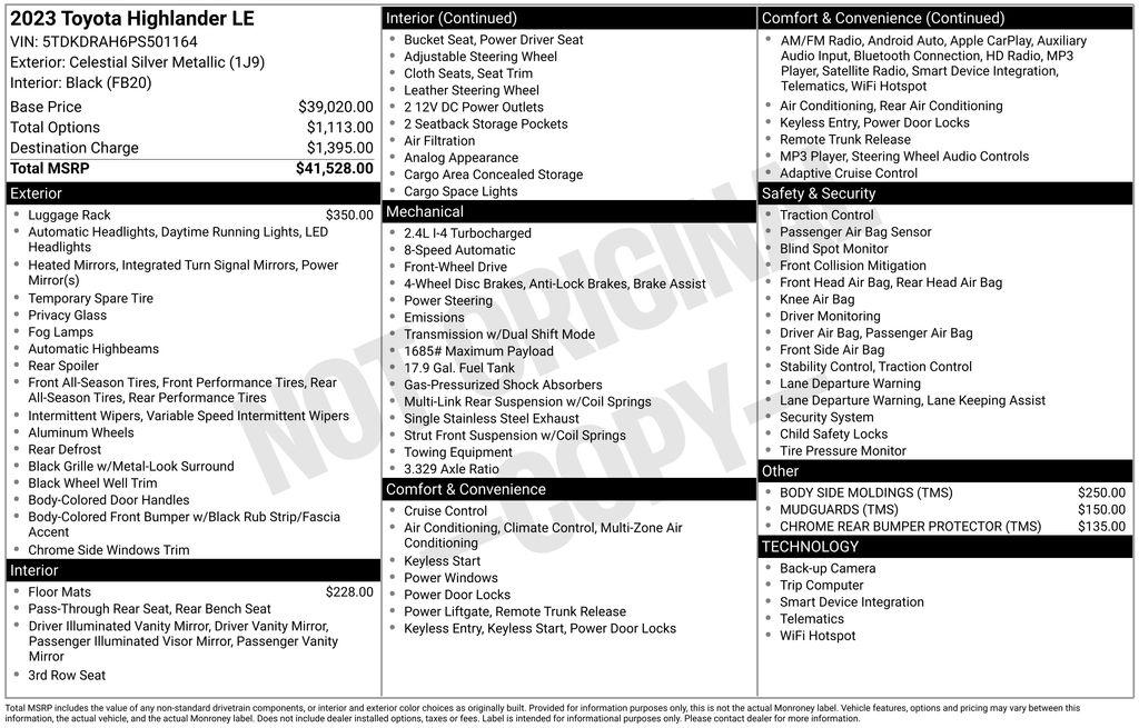 Discover the perfect blend of style, performance, and versatility in the 2023 Toyota Highlander LE. This remarkable SUV is designed to elevate your driving experience, offering a host of advanced features that cater to your every need.Highlighted by its impressive list of key features, this Highlander LE stands out from the crowd. The vehicle boasts:• Front dual zone A/C• Remote keyless entry• Traction control• ABS brakes• Low tire pressure warning• Power Liftgate• Electronic Stability Control• Active Cruise Control• Heated door mirrors• Illuminated entry• Alloy wheelsPowered by a robust 2.4L I4 PDI Turbocharged DOHC 16V LEV3-SULEV30 265hp engine paired with an 8-Speed Automatic transmission, the Highlander LE delivers a thrilling and efficient driving experience. With its impressive fuel economy of 22 MPG in the city and 29 MPG on the highway, this SUV is both economical and environmentally-conscious.Beyond its impressive performance, the Highlander LE is packed with a wealth of advanced features that cater to your every need. Enjoy the convenience of a Power Liftgate, the security of a Rear Camera, and the comfort of Dual-Zone Climate Control. Stay connected with the 8"" Toyota Audio Multimedia system, complete with Apple CarPlay and Android Auto integration. Safety is also a top priority, with features like ABS Brakes, Traction Control, and Electronic Stability Control ensuring a secure and confident drive.The Highlander LE's sleek and modern exterior, complemented by its Silver color, exudes a sophisticated and timeless appeal. Step inside and discover the spacious and well-appointed cabin, designed with your comfort in mind. The split-folding rear seats and available 3rd-row seating provide ample room for passengers and cargo, making this SUV the perfect companion for your adventures.Whether you're commuting, running errands, or embarking on a family road trip, the 2023 Toyota Highlander LE is the ideal choice. With its impressive performance, advanced features, and exceptional versatility, this SUV is poised to exceed your expectations and elevate your driving experience to new heights.We invite you to experience the Highlander LE firsthand. Visit our showroom today and let us demonstrate how this remarkable SUV can enhance your life on the road.
