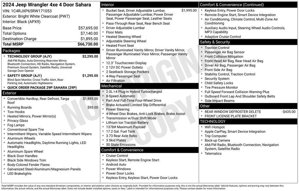 2024 Jeep Wrangler Sahara 4xe Check out all these great option's Quick Order Package 29P Sahara, Safety Group (Auto High Beam Headlamp Control, Blind Spot & Cross Path Detection, and ParkSense Rear Park Assist System), Technology Group (12.3"" Touchscreen Display, 4G LTE Wi-Fi Hot Spot, Alpine Premium Audio System, Apple CarPlay, Auto-Dimming Rear-View Mirror, Connected Travel & Traffic Services, Connectivity - US/Canada, Disassociated Touchscreen Display, Google Android Auto, GPS Navigation, HD Radio, Integrated Center Stack Radio, Integrated Off-Road Camera, Integrated Voice Command w/Bluetooth, Radio: Uconnect 5 Nav w/12.3"" Display, SiriusXM Radio Service, SiriusXM w/360L, and Universal Garage Door Opener), 3.73 Rear Axle Ratio, 4-Wheel Disc Brakes, 8 Speakers, ABS brakes, Air Conditioning, Alloy wheels, AM/FM radio: SiriusXM, Apple CarPlay/Android Auto, Automatic temperature control, Body Color 3-Piece Hard Top, Brake assist, Cloth Low-Back Bucket Seats, Compass, Delay-off headlights, Driver door bin, Driver vanity mirror, Dual front impact airbags, Dual front side impact airbags, Electronic Stability Control, Emergency communication system: Jeep Connect, Freedom Panel Storage Bag, Front anti-roll bar, Front Bucket Seats, Front Center Armrest w/Storage, Front dual zone A/C, Front fog lights, Front License Plate Bracket, Front reading lights, Fully automatic headlights, Heated door mirrors, Heated front seats, Heated steering wheel, Illuminated entry, Integrated roll-over protection, Low tire pressure warning, No Soft Top, Occupant sensing airbag, Outside temperature display, Overhead airbag, Panic alarm, ParkView Rear Back-Up Camera, Passenger door bin, Passenger vanity mirror, Power door mirrors, Power steering, Power windows, Radio data system, Radio: Uconnect 5 w/12.3"" Display, Rear anti-roll bar, Rear reading lights, Rear seat center armrest, Rear Window Defroster, Rear Window Wiper/Washer, Remote keyless entry, Security system, Side Steps, Speed control, Split folding rear seat, Sport Suspension, Steering wheel mounted audio controls, Tachometer, Telescoping steering wheel, Tilt steering wheel, Traction control, Trip computer, Variably intermittent wipers, Voltmeter, and Wheels: 20"" x 8"" Painted Black Aluminum. Recent Arrival!Dealer Detailed, 160 Point Inspection, Recent Oil Change.Toyota of Slidell is the leader in customer service on the North shore. Come experience what a great car dealer can be.For directions to Toyota of Slidell Click belowhttp://www.toyotaofslidell.com/slidell-toyota-directions.htm *Picture may not represent actual vehicle. Price varies based on Trim Levels and Options. Certain vehicles listed may not be available, or may have different prices, or be equipped with dealer installed options. See Dealer for in-stock inventory & actual selling price. All prices plus tax, title & license with approved credit. MSRP includes delivery, processing, and handling fees. Dealer doc fee $425.00 not included in price. Prices may be different outside of each advertised period and do not necessarily reflect cash price at any other time.
