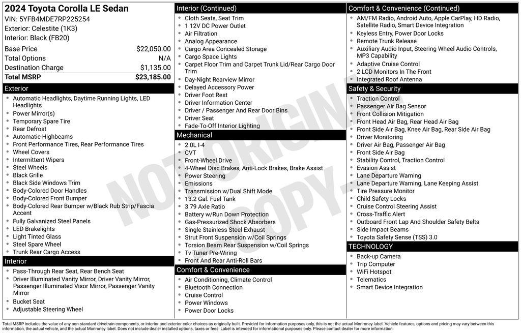 2024 Toyota Corolla LE Check out all these great option's 16"" Steel Wheels w/Covers, 4-Wheel Disc Brakes, 6 Speakers, ABS brakes, Air Conditioning, AM/FM radio: SiriusXM, Auto High-beam Headlights, Automatic temperature control, Brake assist, Bumpers: body-color, Delay-off headlights, Driver door bin, Driver vanity mirror, Dual front impact airbags, Dual front side impact airbags, Electronic Stability Control, Emergency communication system: Safety Connect (up to 10-year trial subscription), Exterior Parking Camera Rear, Fabric Seat Trim, Front anti-roll bar, Front Bucket Seats, Front Center Armrest, Front reading lights, Front wheel independent suspension, Fully automatic headlights, Illuminated entry, Knee airbag, Low tire pressure warning, Occupant sensing airbag, Outside temperature display, Overhead airbag, Panic alarm, Passenger door bin, Passenger vanity mirror, Power door mirrors, Power steering, Power windows, Radio data system, Radio: 8"" Toyota Audio Multimedia, Rear anti-roll bar, Rear seat center armrest, Rear side impact airbag, Rear window defroster, Remote keyless entry, Speed control, Split folding rear seat, Steering wheel mounted audio controls, Tachometer, Telescoping steering wheel, Tilt steering wheel, Traction control, and Trip computer. Recent Arrival! 32/41 City/Highway MPGDealer Detailed, 160 Point Inspection, Recent Oil Change.Toyota of Slidell is the leader in customer service on the North shore. Come experience what a great car dealer can be.For directions to Toyota of Slidell Click belowhttp://www.toyotaofslidell.com/slidell-toyota-directions.htm *Picture may not represent actual vehicle. Price varies based on Trim Levels and Options. Certain vehicles listed may not be available, or may have different prices, or be equipped with dealer installed options. See Dealer for in-stock inventory & actual selling price. All prices plus tax, title & license with approved credit. MSRP includes delivery, processing, and handling fees. Dealer doc fee $425.00 not included in price. Prices may be different outside of each advertised period and do not necessarily reflect cash price at any other time.