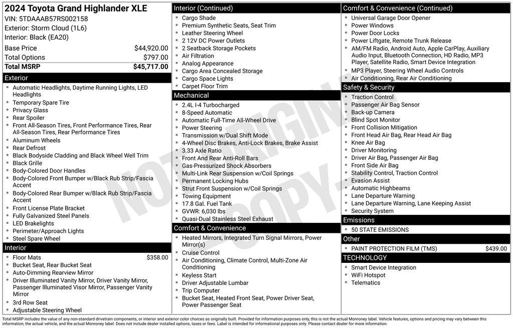 2024 Toyota Grand Highlander XLE Check out all these great option's 18"" Aluminum Alloy Wheels, 3.33 Axle Ratio, 3rd row seats: split-bench, 4-Wheel Disc Brakes, 6 Speakers, ABS brakes, Air Conditioning, Alloy wheels, AM/FM radio: SiriusXM, Apple CarPlay/Android Auto, Auto High-beam Headlights, Auto-dimming Rear-View mirror, Automatic temperature control, Brake assist, Bumpers: body-color, Delay-off headlights, Driver door bin, Driver vanity mirror, Dual front impact airbags, Dual front side impact airbags, Electronic Stability Control, Emergency communication system: Safety Connect (up to 10-year trial subscription), Exterior Parking Camera Rear, Four wheel independent suspension, Front anti-roll bar, Front Bucket Seats, Front Center Armrest, Front dual zone A/C, Front reading lights, Fully automatic headlights, Garage door transmitter: HomeLink, Heated door mirrors, Heated Front Seats, Heated front seats, Illuminated entry, Knee airbag, Leather Shift Knob, Leather steering wheel, Low tire pressure warning, Navigation system: Drive Connect Cloud Navigation (1-year trial subscription), Occupant sensing airbag, Outside temperature display, Overhead airbag, Overhead console, Panic alarm, Passenger door bin, Passenger vanity mirror, Power door mirrors, Power driver seat, Power Liftgate, Power passenger seat, Power steering, Power windows, Radio: 12.3"" Toyota Audio Multimedia, Rear air conditioning, Rear anti-roll bar, Rear reading lights, Rear window defroster, Rear window wiper, Reclining 3rd row seat, Remote keyless entry, Security system, SofTex Seat Trim, Speed control, Speed-sensing steering, Split folding rear seat, Spoiler, Steering wheel mounted audio controls, Tachometer, Telescoping steering wheel, Tilt steering wheel, Traction control, Trip computer, Turn signal indicator mirrors, and Variably intermittent wipers. Recent Arrival! 21/27 City/Highway MPGDealer Detailed, 160 Point Inspection, Recent Oil Change.CARFAX One-Owner.Toyota of Slidell is the leader in customer service on the North shore. Come experience what a great car dealer can be.For directions to Toyota of Slidell Click belowhttp://www.toyotaofslidell.com/slidell-toyota-directions.htm *Picture may not represent actual vehicle. Price varies based on Trim Levels and Options. Certain vehicles listed may not be available, or may have different prices, or be equipped with dealer installed options. See Dealer for in-stock inventory & actual selling price. All prices plus tax, title & license with approved credit. MSRP includes delivery, processing, and handling fees. Dealer doc fee $425.00 not included in price. Prices may be different outside of each advertised period and do not necessarily reflect cash price at any other time.