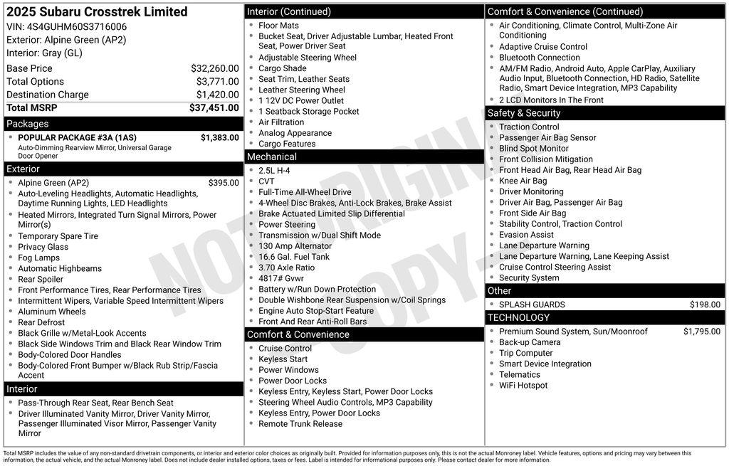 Elevate your driving experience with the 2025 Subaru Crosstrek Limited. This versatile crossover SUV combines exceptional performance, advanced technology, and unparalleled style, making it the perfect companion for your adventures.Boasting a robust 2.5L 4-Cylinder DOHC 16V engine paired with Lineartronic CVT and Subaru's renowned Symmetrical All-Wheel Drive, the Crosstrek Limited delivers an impressive balance of power and efficiency, with an EPA-estimated 27 city/33 highway MPG.Standout features include:• harman/kardon Surround Sound Speaker System• Power Moonroof• Rear Bumper Cover• Auto-Dimming Exterior Mirror with Approach Light• All-Weather Floor Liners• Auto-Dimming Mirror with Compass & HomeLink• LED Upgrade• Rear Seatback ProtectorAdditionally, the Crosstrek Limited is equipped with the Popular Package #3A, elevating your driving experience with even more premium amenities.Slip behind the wheel and experience the exceptional comfort and convenience of the Crosstrek Limited's leather-trimmed interior, featuring heated front seats, a power driver's seat, and a leather-wrapped steering wheel. The 11.6-inch Multimedia Plus System provides seamless connectivity, while the Rear Camera and Auto High-Beam Headlights enhance your confidence on the road.Designed to tackle any adventure, the Crosstrek Limited's rugged yet refined exterior boasts 18-inch alloy wheels, a power moonroof, and a rear spoiler, complemented by the stunning Alpine Green color.With its impressive performance, advanced technology, and exceptional versatility, the 2025 Subaru Crosstrek Limited is the ultimate crossover SUV. Experience the difference for yourself and schedule a test drive today. We're confident you'll be impressed by this exceptional vehicle.