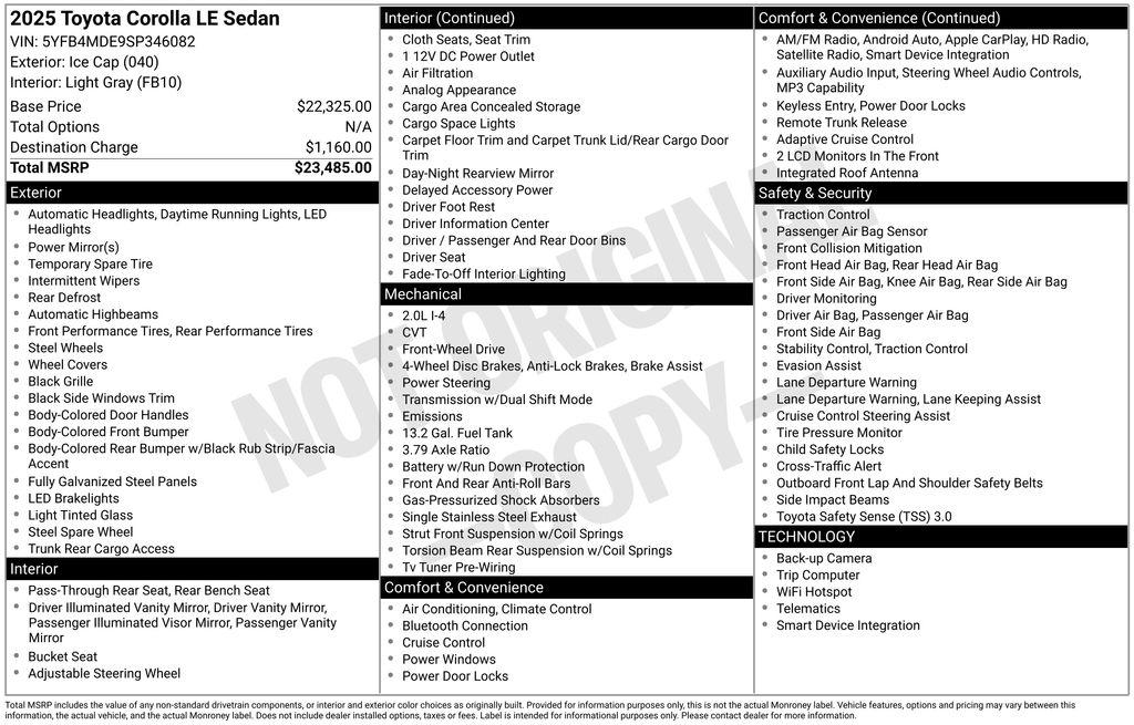 2025 Toyota Corolla LE Check out all these great option's 4-Wheel Disc Brakes, 6 Speakers, ABS brakes, Air Conditioning, AM/FM radio: SiriusXM, Apple CarPlay/Android Auto, Auto High-beam Headlights, Automatic temperature control, Brake assist, Bumpers: body-color, Delay-off headlights, Driver door bin, Driver vanity mirror, Dual front impact airbags, Dual front side impact airbags, Electronic Stability Control, Emergency communication system: Safety Connect (up to 10-year trial subscription), Exterior Parking Camera Rear, Fabric Seat Trim, Front anti-roll bar, Front Bucket Seats, Front Center Armrest, Front reading lights, Front wheel independent suspension, Fully automatic headlights, Illuminated entry, Knee airbag, Low tire pressure warning, Occupant sensing airbag, Outside temperature display, Overhead airbag, Panic alarm, Passenger door bin, Passenger vanity mirror, Power door mirrors, Power steering, Power windows, Radio data system, Radio: 8"" Toyota Audio Multimedia, Rear anti-roll bar, Rear seat center armrest, Rear side impact airbag, Rear window defroster, Remote keyless entry, Speed control, Split folding rear seat, Steering wheel mounted audio controls, Tachometer, Telescoping steering wheel, Tilt steering wheel, Traction control, Trip computer, and Wheels: 16"" Steel with Covers. Recent Arrival! 32/41 City/Highway MPGDealer Detailed, 160 Point Inspection, Recent Oil Change.Odometer is 13649 miles below market average! Clean CARFAX.Toyota of Slidell is the leader in customer service on the North shore. Come experience what a great car dealer can be.For directions to Toyota of Slidell Click belowhttp://www.toyotaofslidell.com/slidell-toyota-directions.htm *Picture may not represent actual vehicle. Price varies based on Trim Levels and Options. Certain vehicles listed may not be available, or may have different prices, or be equipped with dealer installed options. See Dealer for in-stock inventory & actual selling price. All prices plus tax, title & license with approved credit. MSRP includes delivery, processing, and handling fees. Dealer doc fee $425.00 not included in price. Prices may be different outside of each advertised period and do not necessarily reflect cash price at any other time.