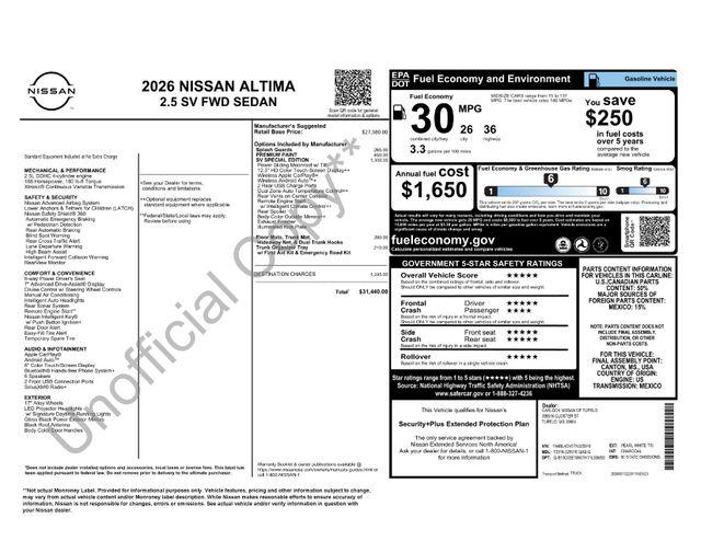 Pearl White Tricoat 2026 Nissan Altima 2.5 SV FWD CVT with Xtronic 2.5L 4-Cylinder DOHC 16V CVT with Xtronic.Recent Arrival! 27/39 City/Highway MPG
