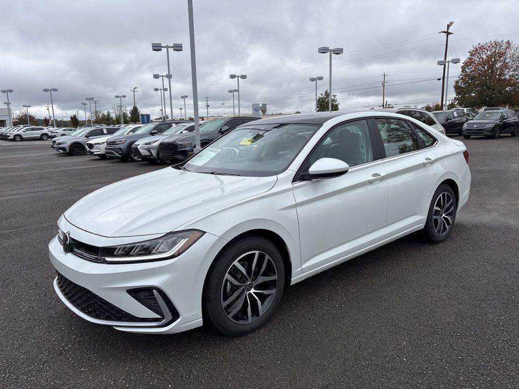 Opal White Pearl 2026 Volkswagen Jetta 1.5T SE FWD 8-Speed Automatic with Tiptronic 1.5L I-4 DI DOHC Turbocharged Atlantic Blue/Storm Gray w/CloudTex & V-Tex Leatherette Seat Trim, First Aid Kit, VW Care.